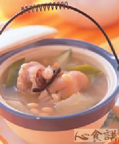 4.将陈皮、作法1的青木瓜块与作法2的黄豆放入作法3的砂锅中,以小火煮约1小时后,加入盐调味即可。