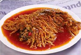 1、鲤鱼杀后鱼两面批斜刀,再用剪刀剪成细丝,调味上浆拍粉,下大油锅炸至成“狮子鱼”。