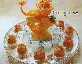 4、内酯豆腐切小粒,汆水。净锅内加入狗肉汤,下入豆腐,调味,勾薄芡,出锅,撒入香菜末,倒入小盅内,码盘即成。