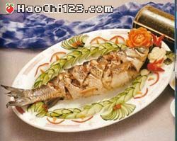 草鱼、1000克。2. 在鱼背片一刀,深约2厘米,把姜、葱、盐、酒、酱油、味精、麻油、胡椒粉合在一起调匀,涂在鱼身内外,腌20分钟后拣去姜、葱,然后用猪网油将原条鱼包起;