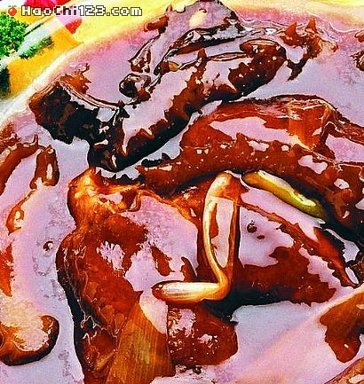 12. 烧开后用湿淀粉勾芡翻锅,淋上花椒油烧在肘子上即成。