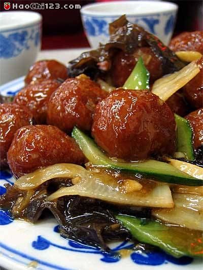 4.勺内放少许油,用葱、姜、蒜炝锅,放入玉兰片、胡萝卜和丸子,再把兑好的味汁倒入勺内,颠翻几个个儿,淋明油出勺。