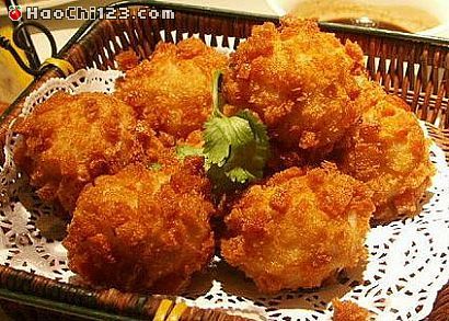 4. 炒锅置中火上,加入花生油,烧至五成热,将虾排放入锅内,用小铲翻动,炸至杏黄色,捞出控油,抽掉牙签,将虾排摆在香菜盘内,外带葱酱碟一起上桌。