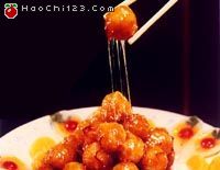 5. 炒锅留油25克,用小火烧至四成热,加入白糖,炒至略呈红色时,迅速倒入炸好的苹果球,再撒匀青红丝,淋上香精颠翻沾匀,盛入盘内即成,外带一小碗凉开水上席。