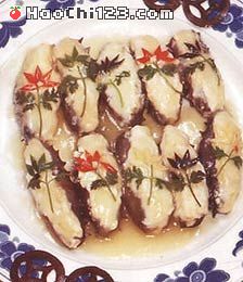 11. 用湿淀粉勾芡,再放入黄酒(25克)、猪油(25克)、味精搅匀,浇在盘内的海参上面即成。