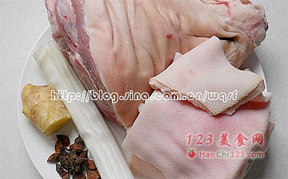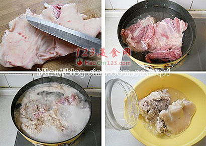 2、刮净表皮,去掉污物及猪毛,放入冷水锅中,大火煮开待有许多浮沫,捞出用温水清洗干净。