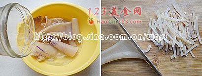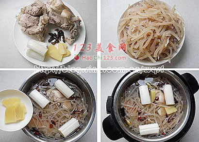 1、隔水蒸制是传统的做法,如想节省时间也可将猪肘和猪皮丝放入压力锅中压制30分钟,更加方便快捷。