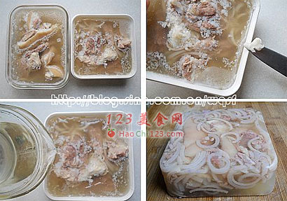 2、水晶肘子与肉皮冻不同,其中肘子所占的比例比胶冻要大很多,所以在切片时要加倍小心,否则会破碎不能成片。
