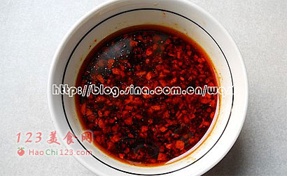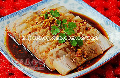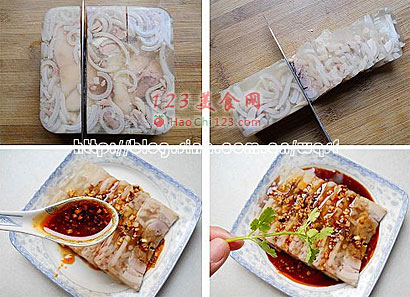 9、将水晶肘子切成1cm厚的长方形薄片,淋在水晶肘子上,或者将配调味汁放入小碗中,蘸食即可。