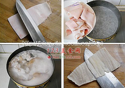 3、刮净表皮,去掉污物及猪毛;锅中放入适量清水,大火烧沸后将肉皮放入,用中火煮制5分钟,再取出沥干水分。待肉皮稍凉后用刀片除猪皮里侧多余的肥肉。