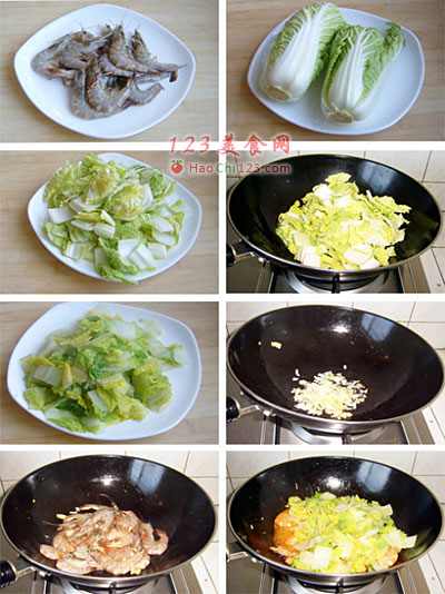 春大虾10只、娃娃菜2棵、精盐、味精、上汤、料酒各适量。2、娃娃菜切片。