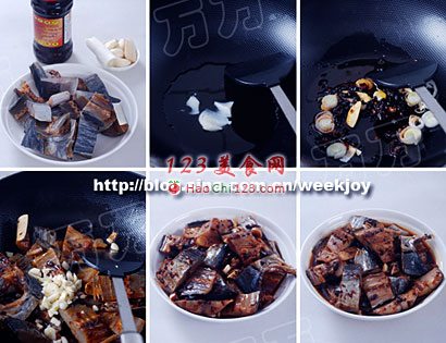 1、腊鱼切块,提前浸泡一会,洗净沥干。蒜切碎。锅里热猪油,葱姜爆香加入豆豉辣酱,小火翻炒一下(可根据腊鱼的风干程度和咸度调节浸泡的时间)。