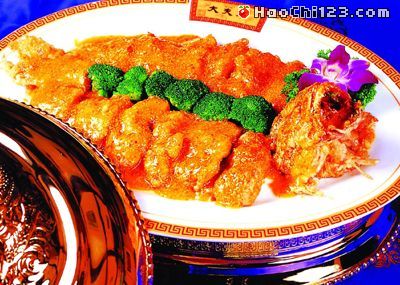 8、这时入金华火腿碎、干贝碎、海米碎、2克盐、4克味精、30克上汤中火加热制成鱼子酱,用水淀粉勾芡浇在鱼上;