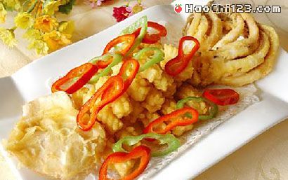 原 料: 鲜鱿鱼500克、青红椒圈500克、蒜末、美极鲜酱油、脆炸粉1盒、味精、白糖。