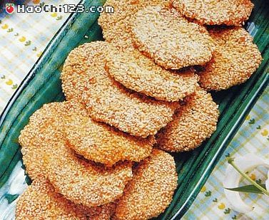 4、净锅滑好,下入调好的虾蓉,按成圆饼,拍上芝麻,慢火煎熟,装盘即可。