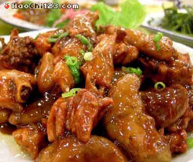 2.炒锅上旺火,热锅注入花生油,六成油温时,将沾匀淀粉的鸡肉下锅内炸至金黄色捞出(多次重油炸,沥干油。炒锅内留油5克,放入葱姜,煸炒出香味时,放入炸好的鸡块随即烹入对好的调料,三颠二翻,淋香油即可出锅。