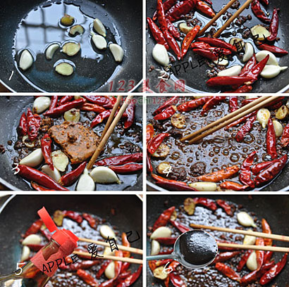 2、放干辣椒花椒拌炒。