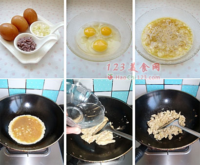 3、炒至蛋液成形时添入少许水,继续翻炒均匀即可。