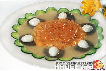 1、鲍鱼切成薄片。鸽蛋煮熟去壳粘上玉米粉入热油炸成金黄色,一分为二备用。