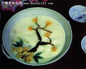 3、锅置旺火上,下高汤烧沸,加入精盐2在、味精、绍酒调匀,淋于芙蓉干贝上即成。