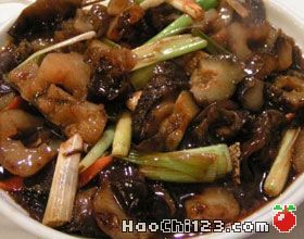 7. 炒锅留余油,放在中火上烧热,将瘦肉、冬笋、香菇放入锅内,加酱油、味精、黄酒、白糖煸炒,再倒入奶汤250克,放入过油葱段、刺参烩3分钟;