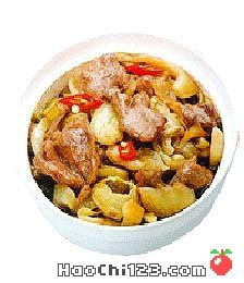 腌牛肉250克、酸菜茎薄片200克、以葱自、辣椒、蒜茸为配料、油味料等。