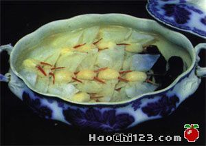 4、鸭蛋清盛于碗内,打散,取铁勺一放在火上烧热取出。另取猪肥膘肉1小块,在勺内擦匀,然后舀入一匙蛋淮绕一圈,使之受热后凝成圆薄皮子,放入馅丸1个,将铁勺放中火上煎筷子将皮子折成两具半圆形拢合状,并把裹在里面的馅丸夹一天夹成"玉蝉"表。铁勺离火,轻轻取出,按此制成20只。火腿肉切成长3厘米、半根火柴粗的丝40根,每只玉蝉头部均插上2根。制好与"灵芝"拼装于盘,上笼屉用旺火蒸1分钟取出,分别摆入汤碗的左右两边。