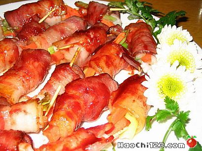 1、将猪腿肉片成24片薄片,每2片要留一边不要片断,使2片能连在一起。