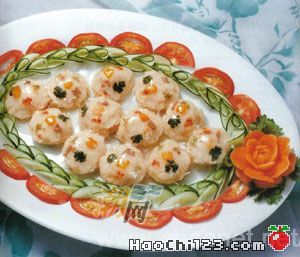 (4)将一串虾胶分别酿在20个小碟上(小碟要先涂上猪油),然后将鱼翅放在虾胶上面, 又一次酿上虾胶,再用蛋白抹滑,放上火腿术, 芫荽叶、芹菜末、金笋化,放入蒸笼用旺火炊熟,取出鱼翅,摆砌盘间,把原汤约100克调上味,用生粉水勾芡淋上即成。
