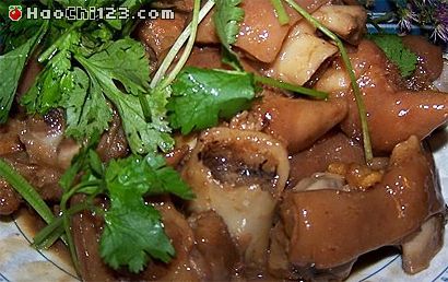③取砂锅1个,内垫竹箅,倒入上汤,放大火上烧滚后,改用小火,放入过油猪蹄。八角、陈皮、小茴香、花椒用净纱布包好下锅,加入香菇、酱油(90克)、酒(35克)、糖、味精,加盖焖3小时后,放入过油栗子肉,再焖30分钟起锅。拣去布包。