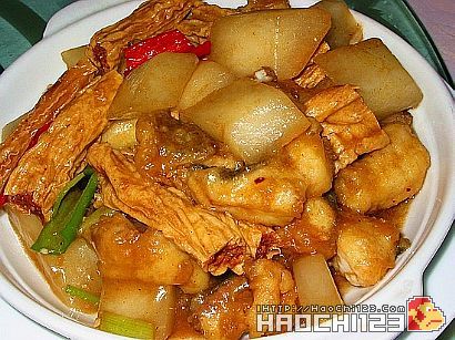 鱼脯一斤、萝卜一斤、姜数片、蒜茸一汤匙、南乳半汤匙、磨鼓一汤匙葱三条切段、酒2汤匙、香菜2棵豆腐、盐、糖、生抽、老抽、果皮八角、生粉各适量。