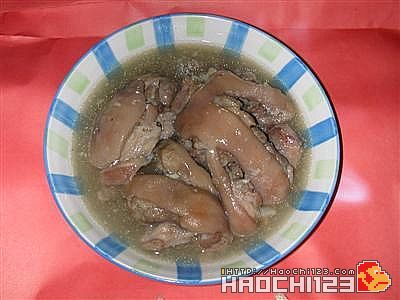 4)煮好后,把肉取出,将沾在肉上的油用卤冲净,称在盆内放好,再把锅内的卤撇清,倒在肴肉上,用木板加石块把肉压紧,等到冷透后解片。