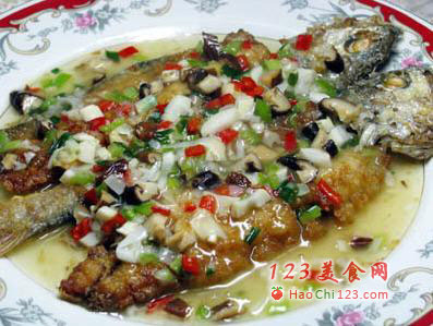 4、锅里留少许的油,下葱、蒜、青红椒、冬笋、香菇粒,调入糖、醋、盐、味精、胡椒粉,用稀淀粉勾芡,淋入麻油起锅浇在鱼上即可。