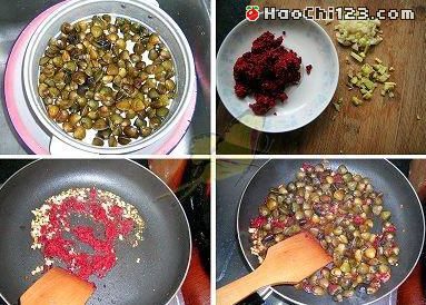 3、加入蚬子,少许盐,糖炒至蚬子壳开就可以了。