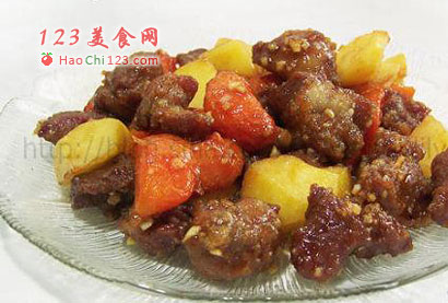 4、起油锅,待油热后中火将肉块下锅炸至金黄色,再炸胡萝卜块和土豆块,最后开大火复炸,捞起,沥去油,倒进大盆中,浇上醉汁,用盆颠翻几下装盘即成。