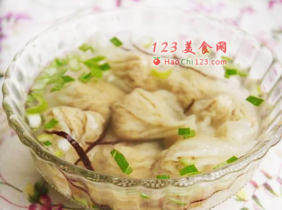 4、将包好的肉燕放在蒸笼里蒸熟,或是在开水中煮熟。