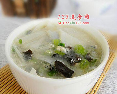 3、放入米糊片再次烧开,加鱼露,撒上葱花即可。