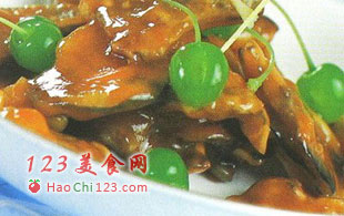 3、起锅入底油,加入调料熬至黏稠时,放入原料翻炒均匀,撒入樱桃即可。