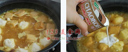 7、加入椰浆后小火再煮1-2分钟,汤汁越来越浓。