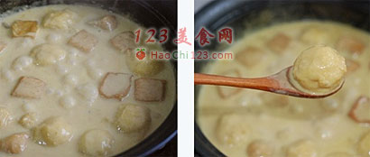 1、发现煮咖喱鱼丸的绝招儿了吗?就是椰桨!椰浆:椰浆与咖喱天生是一对,咖喱是许多香料调和在一起的产物,椰浆刚好能让这些香味柔和的调和在一起。椰浆又能增加咖喱汁的浓度,加入椰浆后汤汁越来越稠,能更好的附着在鱼丸表面。