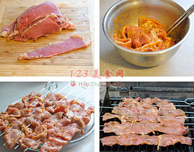 4、BBQ开中火,铺上牛肉串,烤1分半钟,抹少许沙嗲酱后翻面,再烤1分半钟,完成。