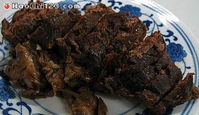 4.放入肉料,用小火焖煮至烂,捞出,坡刀切成三块;
