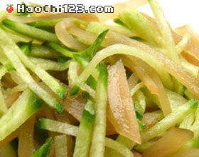 8.食用时,将萝卜条摆在下边,黄瓜条摆在上边呈桥形,点缀上辣椒丝、姜丝即可。