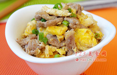 4、利用锅中剩余的底油,加入鸡蛋,待鸡蛋定性后加入炒好的羊肉,加入调味汁翻炒均匀即可出锅。