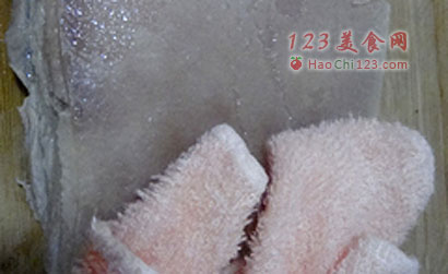 7、酱油:水煮后的五花肉,用干布擦去肉皮表面的水分,趁热在肉皮上面,涂抹一层生抽。