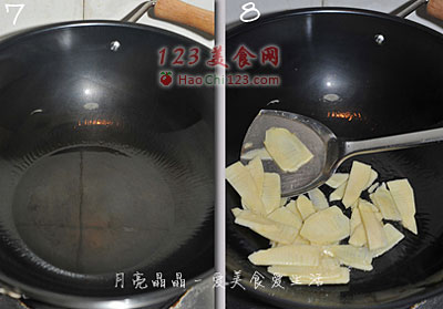 8、油热后,倒入冬笋片煸炒透。