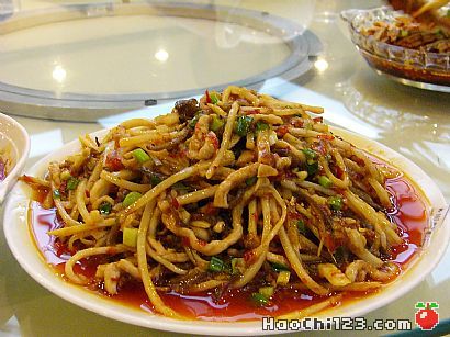 1、里脊肉切细丝,加调料入味后下6成热油中滑熟捞出沥油,锅留底油。