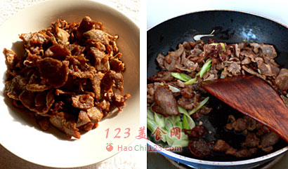 2、炒锅放入食用油,油热五成时放入羊肉片,过油煎炸至酥香,捞出沥油。