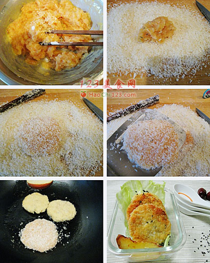 3、再压成圆形,或者方形都可以,两面保证都沾上足够的面包屑。