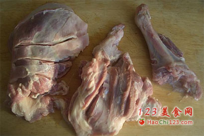 1、羊腿一条,用花椒水浸泡1小时后,取出洗干净,从骨缝处截成3块。